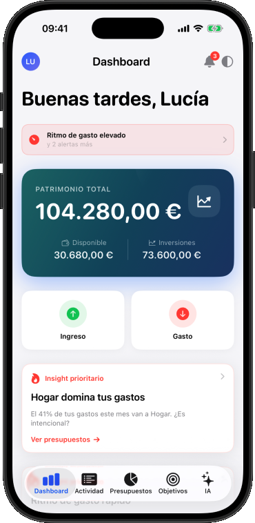 Dashboard con patrimonio, ahorro, actividad reciente y señales útiles.